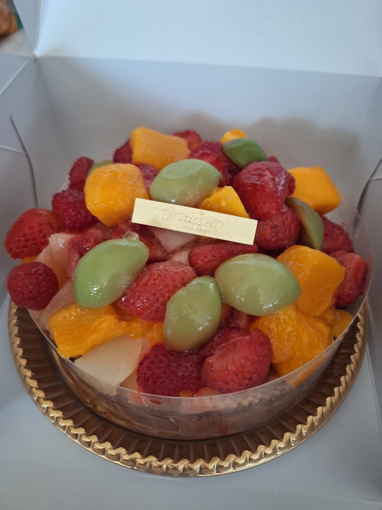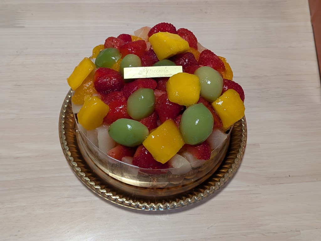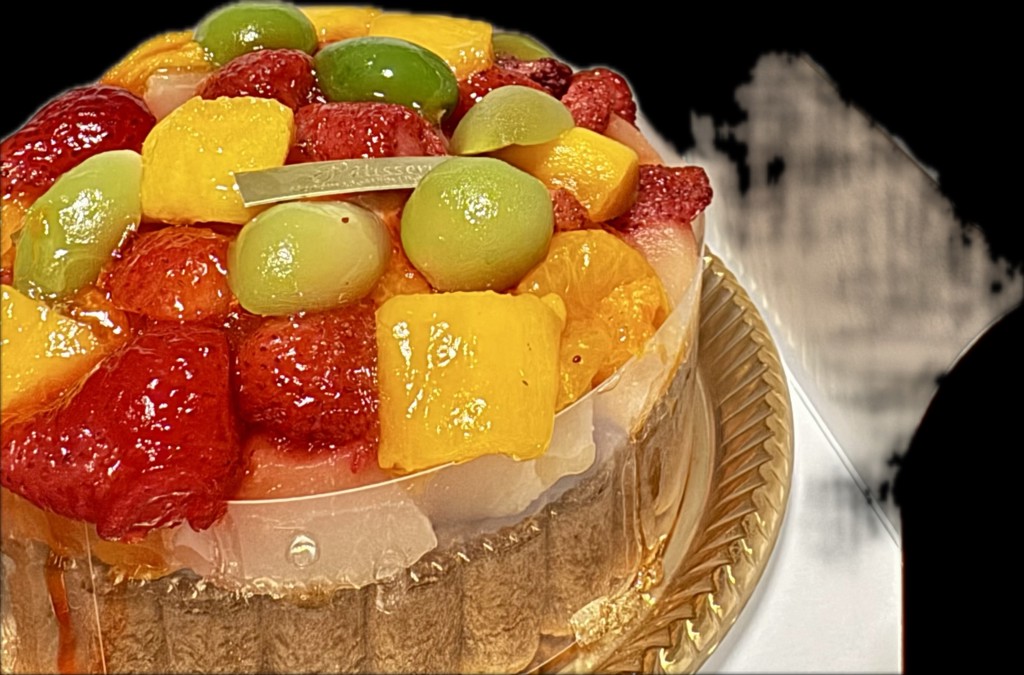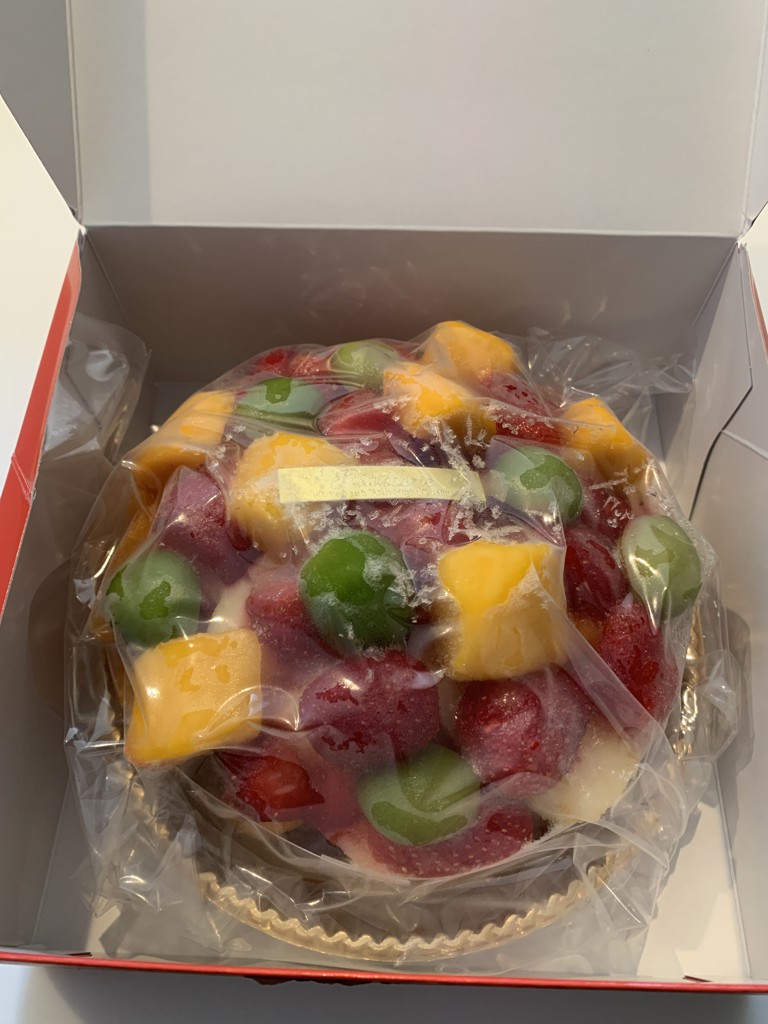 - 大満足で上に乗ってるマンゴーやマスカットは切り分ける前に食べられちゃいました。冷凍にしてはクォリティ高いと思います。