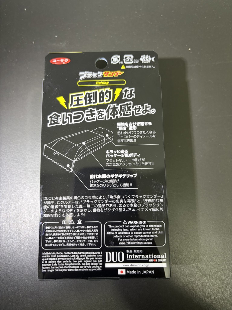 - あのブラックサンダーがルアーになってる!? さすがDUOのクオリティ、パッケージも忠実に再現されていて、本物のチョコの様な質感。 大きさこそ違うものの水中でこのルアーを見たブラックバスや他の魚も気にな…続きを見る