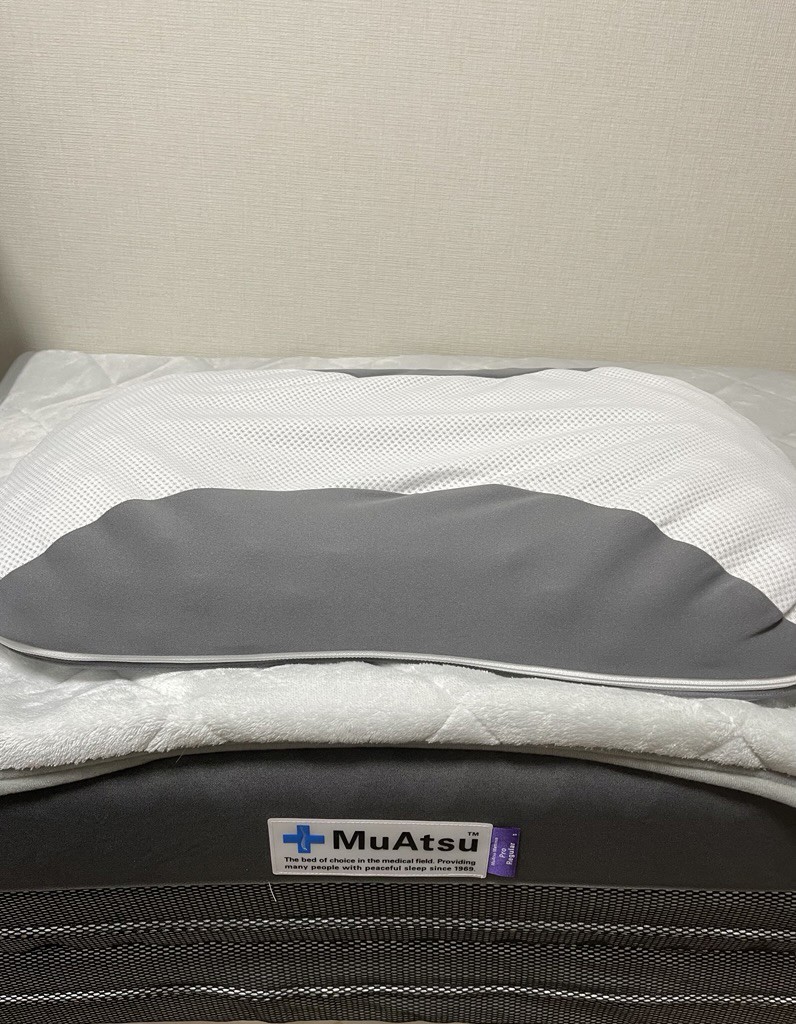 - ムアツ枕、調節で高さを低い目にして、いい感じになりました