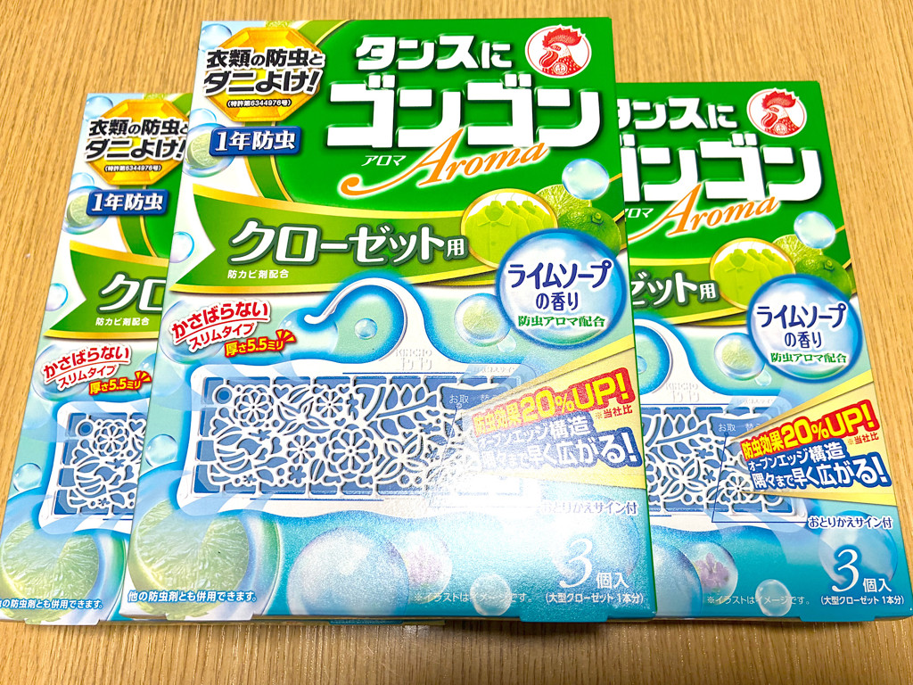 購入サイトからの回答2025.01.07- この度は「KINCHO タンスにゴンゴン アロマ クローゼット用 ライムソープの香り」をご購入いただき、誠にありがとうございます(ㅅ´ ˘ `) いつもご愛用いただいているとのこと、そして香りや防虫効果にご満足いただけているようで、当店といたしましてもうれしい限りでございます!ご購入もお得に感じていただけたようで何よりです。これからもお得に、ハピネスダイレクトで上手にお買い物くださいませ。今後ともどうぞよろしくお願いいたします( ⁎ᵕᴗᵕ⁎ ) またのご利用を、心よりお待ちしております♪