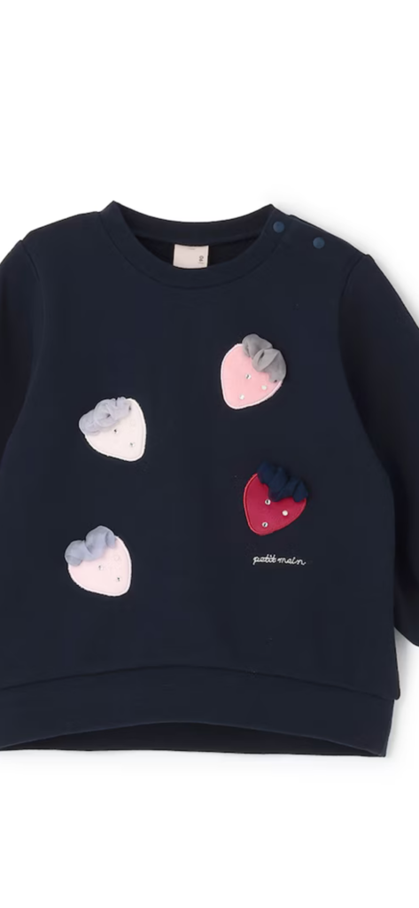 - 汚れが目立たないので、紺色を選びました。いちごのデザインが引き立って、かわいいです。身長105センチで、120センチを購入。多少、袖が長いですが、長く着れそうです。
