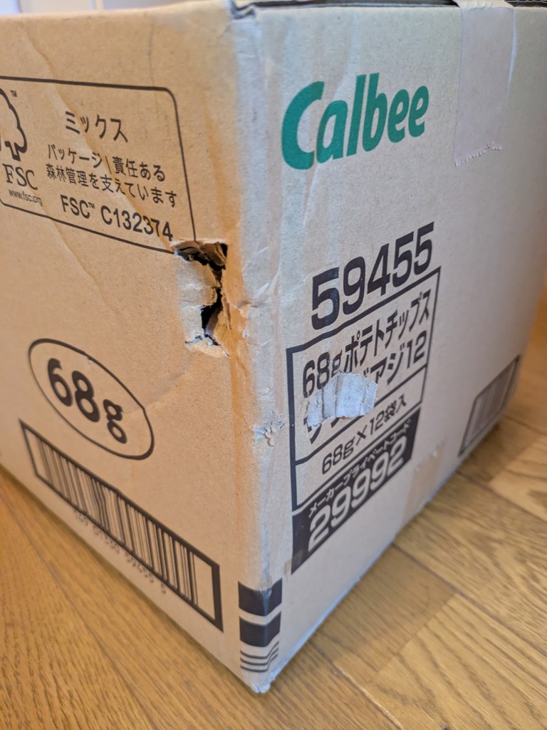購入サイトからの回答2025.12.24- この度はポテトチップスサラダ味をご購入いただき、誠にありがとうございます。 また、段ボール箱に穴があいていたとのことで、ご不快な思いをさせてしまいましたこと、心よりお詫び申し上げます。 誠に申し訳ございませんが、弊社では商品到着後7日以内にご連絡をいただいた場合に限り、返品・交換の対応を承っております。 今回、商品到着から7日以上が経過しているため、対応が難しい状況となっておりますこと、何卒ご理解いただけますと幸いです。 今後、商品に関するご不明点やお気づきの点がございましたら、どうぞお気軽にお問い合わせください。 改めまして、この度の件につきまして深くお詫び申し上げます。